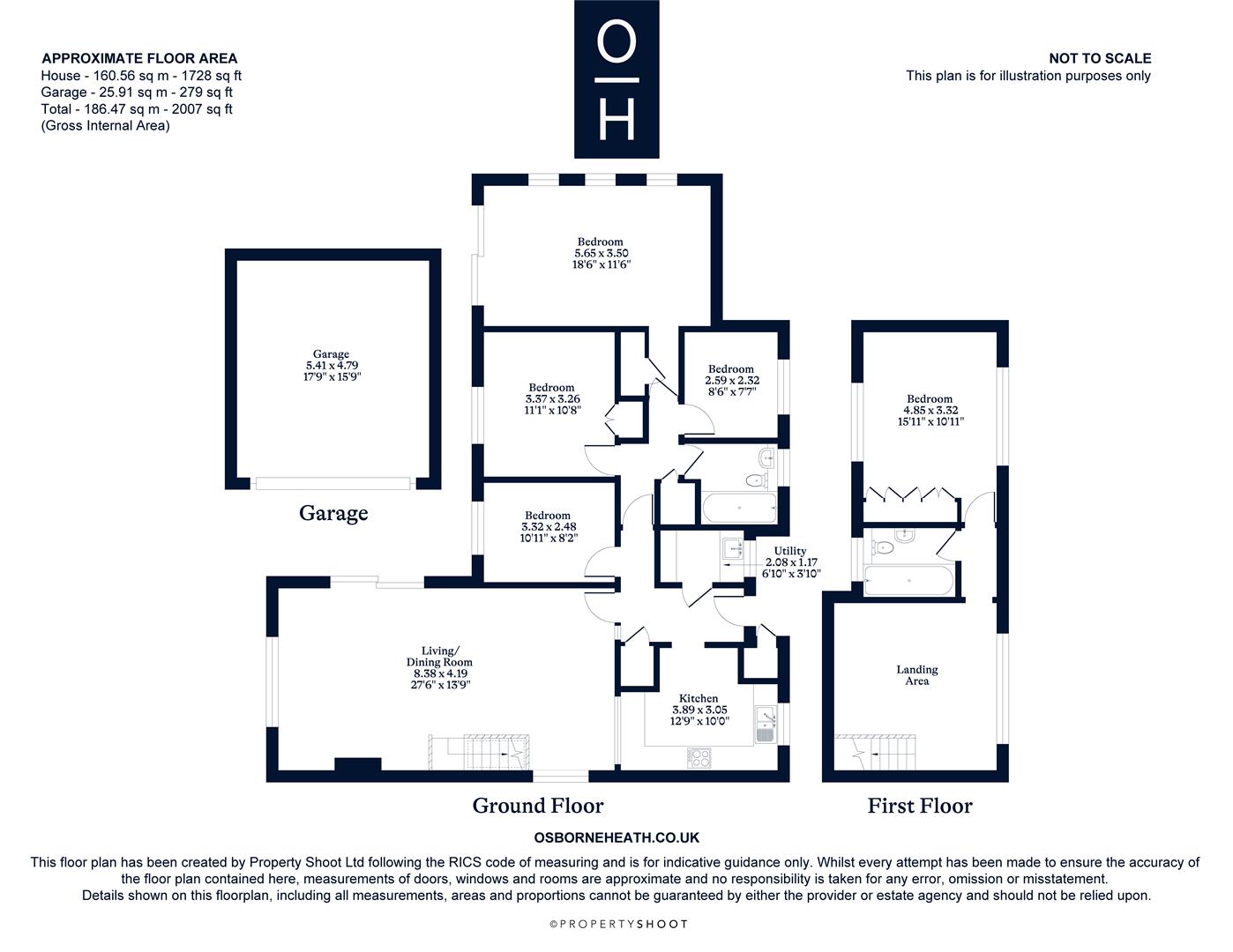 Downstairs there is a living room with dining area, kitchen, utility room, four bedrooms and a family bathroom.