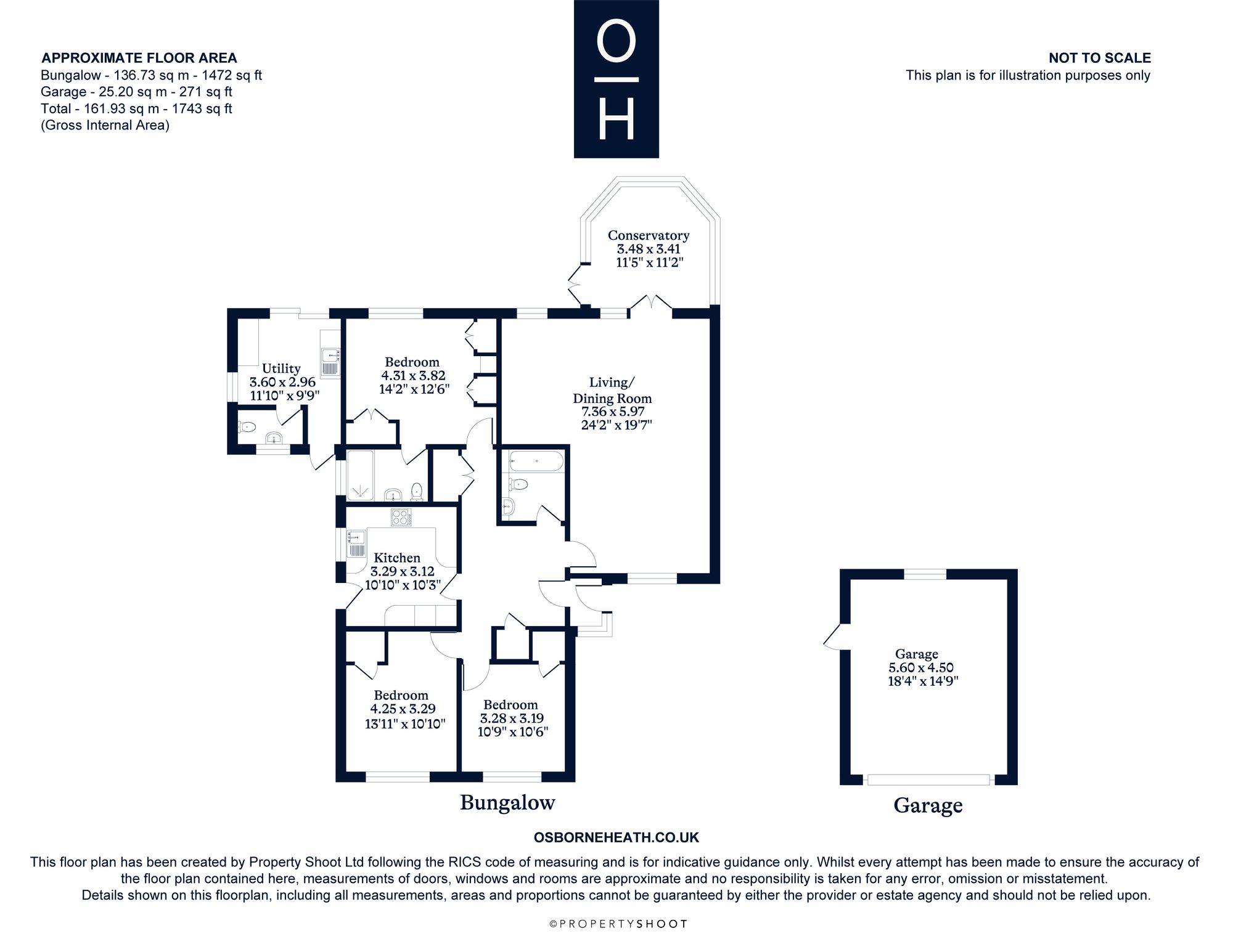 This detached bungalow comprises a principal bedroom with built-in wardrobes and en suite bathroom, a further double bedroom with built-in wardrobes, third bedroom and a family bathroom. There is also a kitchen, large living and dining room which leads out to the conservatory, utility room and an extra WC.