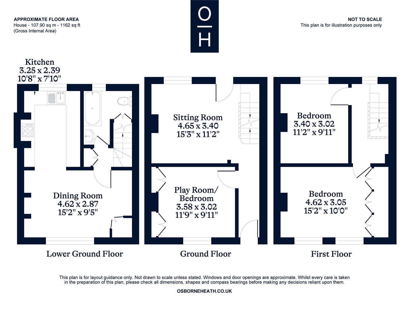The lower ground floor accommodation comprises a dining room, kitchen and a white bathroom suite.