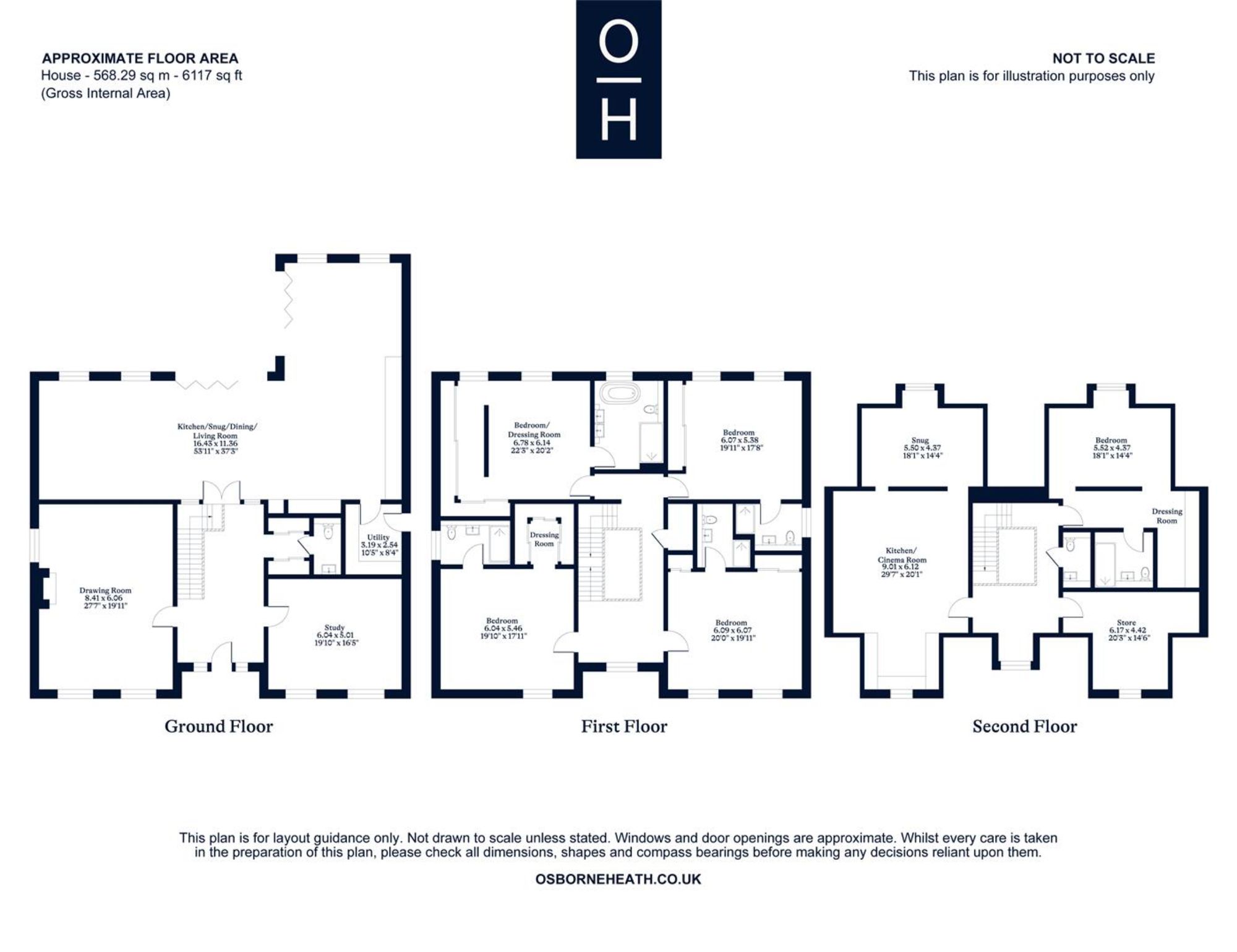 The ground floor has a drawing room, study, dining room, living room, kitchen with breakfast bar and snug area, separate utility and a downstairs WC.