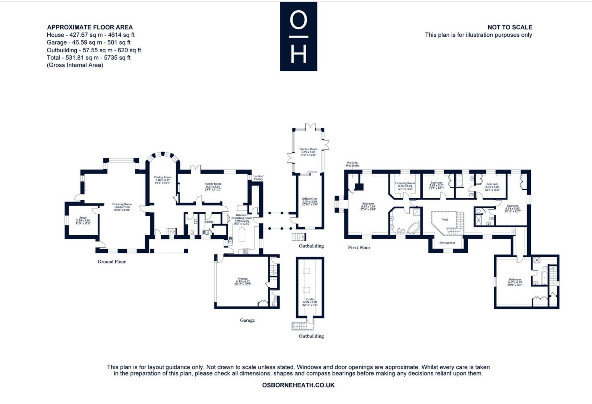 On the first floor is the principal bedroom which has a four-piece en suite and a walk-in dressing room. Two further large bedrooms with built-in wardrobes and en suites and two double bedrooms with built-in wardrobes and a shared Jack and Jill bathroom.