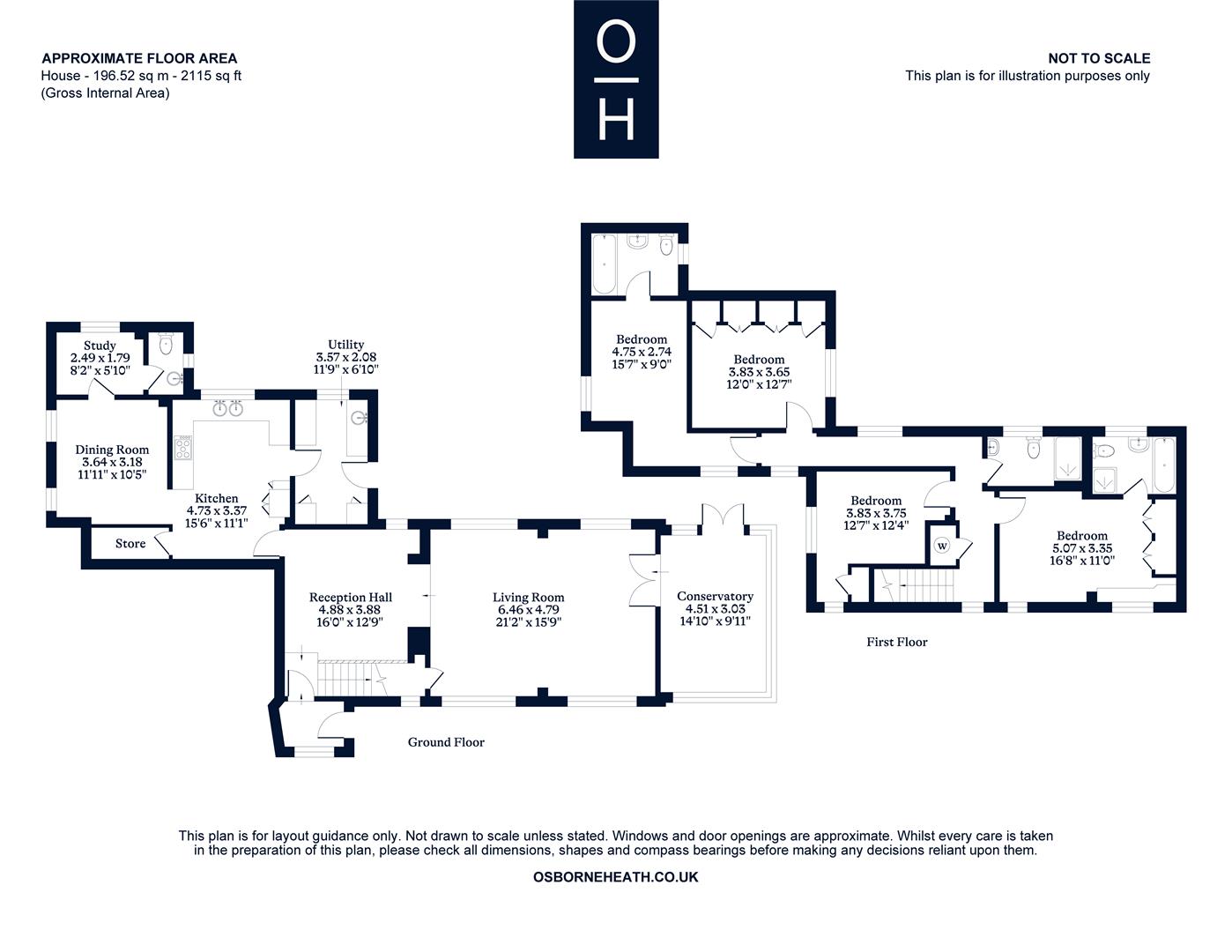 The ground floor of this character property has a large reception hall, living room and a conservatory. The kitchen is open plan to the dining room and there is also a utility room, study and a downstairs WC.