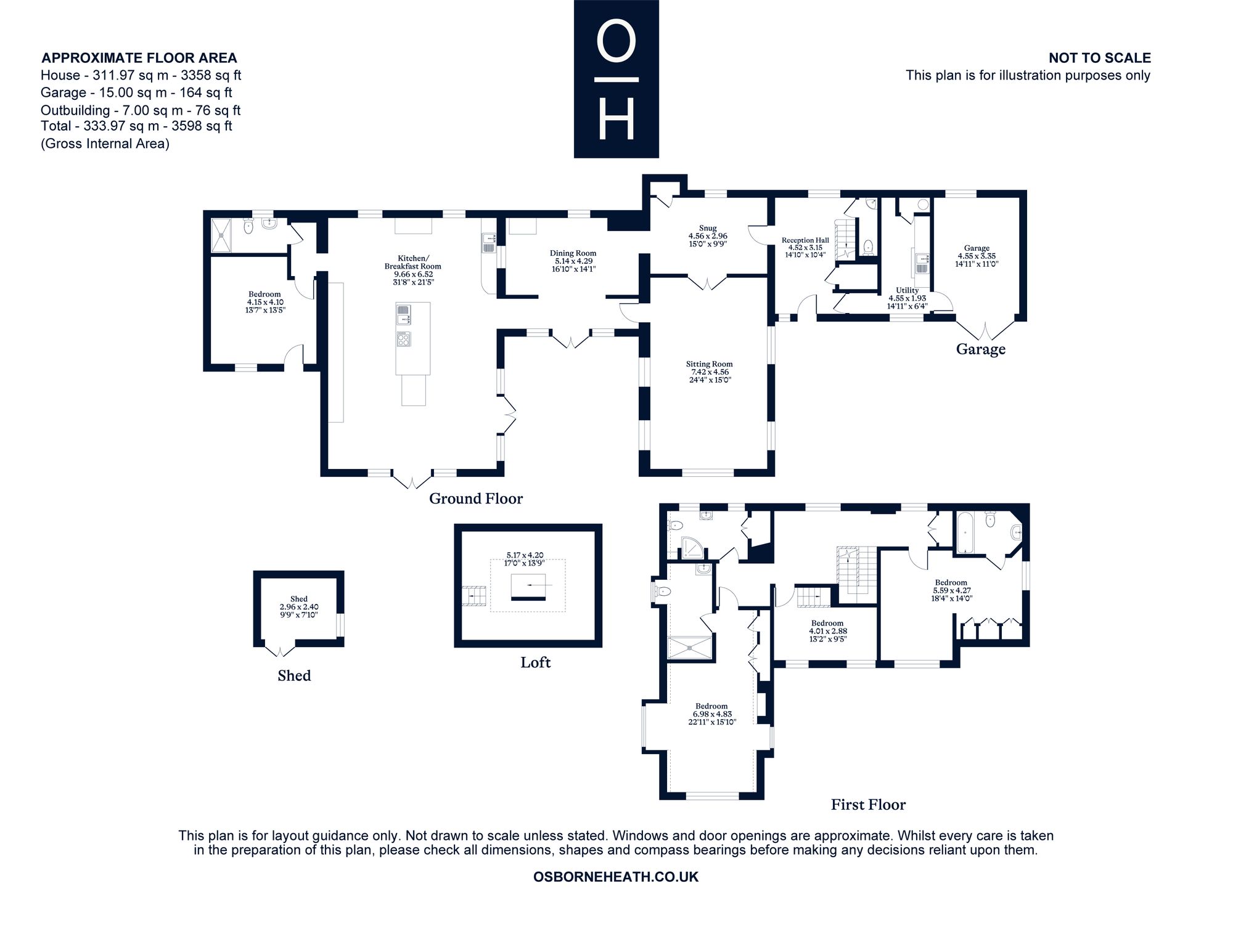 The first floor has the principal bedroom with a modern en suite, guest room with an en suite and built-in wardrobes, third bedroom, and a family bathroom.